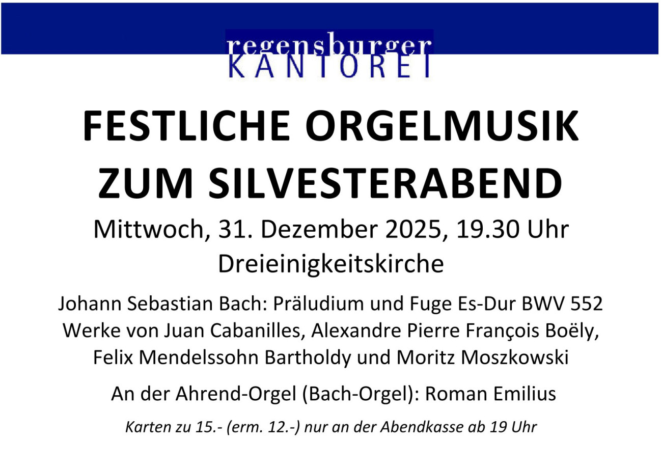 Festliche Orgelmusik zum Silvesterabend heißt es wieder am Mittwoch, 31. Dezember um 19.30 Uhr. An der Ahrend-Orgel der Dreieinigkeitskirche spielt Kirchenmusikdirektor Roman Emilius. Genussfroh führt er durch die Länder Spanien und Frankreich zurück nach Deutschland, um mit dem lichtdurchfluteten Präludium und Fuge in Es-Dur von Johann Sebastian Bach zu schließen. Ein königliches Hauptwerk der Orgelliteratur!